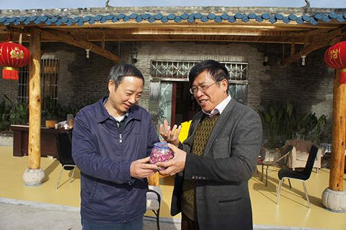 在南充雙龍農(nóng)牧開(kāi)發(fā)有限公司,臺(tái)商林云飛(右)向周敏謙(左)介紹其開(kāi)發(fā)的農(nóng)產(chǎn)品。