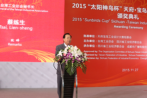 蔡練生在致辭中指出,“太陽(yáng)神鳥(niǎo)杯”天府.寶島工業(yè)設(shè)計(jì)大賽已成為川臺(tái)兩地之間合作交流的一個(gè)重要平臺(tái),促進(jìn)了兩地科技產(chǎn)業(yè)的合作進(jìn)步。他說(shuō),天府·寶島工業(yè)設(shè)計(jì)大賽舉辦五年來(lái)每年都有進(jìn)步,期待大賽一年比一年辦得更好。他表示,臺(tái)灣工業(yè)總會(huì)將繼續(xù)致力于與四川方面共同推動(dòng)兩地科技創(chuàng)新成果的轉(zhuǎn)化。