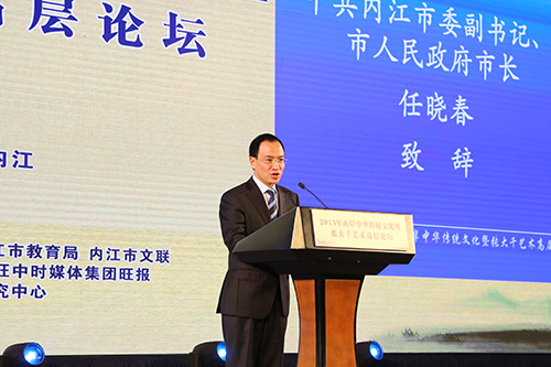 內江是國畫大師張大千的故鄉,具有深厚的文化底蘊。此次論壇旨在打造兩岸中華傳統文化交流的高端平臺,傳承弘揚中華傳統文化和大千文化,促進兩岸文化繁榮發展。 “豐饒的土地積淀著深厚的甜城底蘊,悠久的歷史孕育了璀璨的漢安文化。”任曉春在致辭中表示,作為二十世紀最富傳奇色彩,由內江芭蕉井滋養、長眠于臺灣梅丘之下的國畫大師張大千,享有“東張西畢”“南張北齊”“五百年來第一人”之美譽。他用畢生心血,固守中華文化之根,承續華夏歷史之脈,不僅弘揚了中華優秀傳統文化,更締結了內江與臺灣兩地的不絕情緣。他期翼兩岸攜手,弘揚大千藝術,推進傳統文化交流。