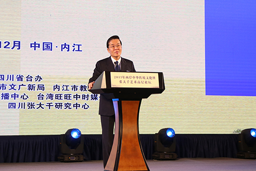 中國臺灣網12月28日內江訊 2015年12月24日至26日, 2015年兩岸中華傳統文化暨張大千藝術高層論壇在四川內江舉辦。四川省政府副秘書長陳越良宣布開幕,四川省臺辦主任周敏謙、內江市市長任曉春和中國國民黨中央評議委員會主席團主席張榮恭等出席開幕式并致辭,內江市委副書記周勇主持開幕式。蘇叔陽、魏明倫、黃光男、鄭愁予等來自海峽兩岸的文人名人、專家學者、臺商代表、青年學生等近200人參加。
