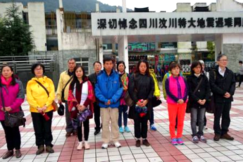 在汶川大地震遺址為遇難同胞默哀