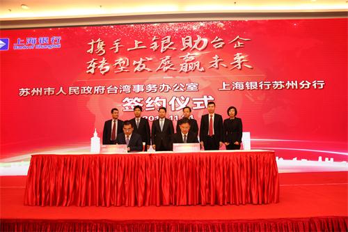 蘇州市臺辦主任楊軍和上海銀行蘇州分行行長崔慶軍簽署了金融服務臺企發展協議文本。(中國臺灣網、蘇州臺辦聯合報道)