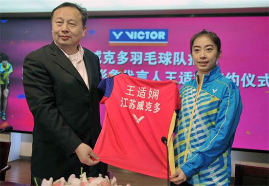 中國臺灣網2月23日南京訊 2月20日,江蘇威克多羽毛球隊揭牌暨VICTOR全球形象代言人世界冠軍王適嫻簽約儀式在南京體育學院舉行。南京市臺協副會長、冠名贊助企業南京勝利體育用品實業有限公司總經理陳庶元和世界冠軍王適嫻簽訂全球形象代言人合約并贈予戰袍。