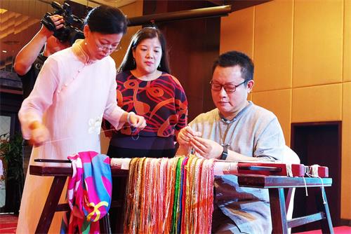 沈德龍是大陸刺繡界的翹楚,他的繡品《蒙娜麗莎的微笑》傾倒了許多人。但鮮有人知是他的妻子是來自臺灣的英語老師。時間回到2003年,一位臺灣客戶來到沈德龍工作室參觀,被他正繡著的一幅《貴婦人》所吸引,不停稱贊“真像”。不久之后,這位客戶帶著自己的女兒蘇嘉莉來到蘇州,沈德龍一看,蘇嘉莉長得正像他那幅繡品中的女子。回憶起兩人相識的傳奇經歷,沈德龍話語中依然透著甜蜜,不時感慨緣分的神奇。如今,蘇嘉莉除了在家相夫教子,也協助丈夫經營公司,是沈德龍得力的“賢內助”。他們生育了三個孩子,其中還有一對龍鳳胎。三個孩子活潑可愛,三人志向各不相同,一個喜歡畫畫,一個喜歡書法,只有小女兒表示要“女承父業”,聽著孩子訴說理想,夫妻二人眼中滿是欣慰。活動現場,沈德龍展示了歷時兩年完成的長達六米的繡品《富春山居圖》,他說:“黃公望的《富春山居圖》現在分藏兩岸,2011年才在臺北迎來了合璧展出的歷史性一刻。所以我想用這幅繡品展現這部巨作,寓意著兩岸一家親,希望兩岸能像這幅《富春山居圖》一樣早日合璧!”