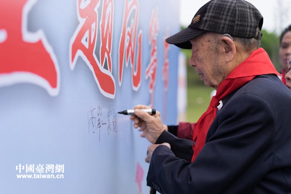臺胞姚家新在活動展板上激動寫下“兩岸一家親”