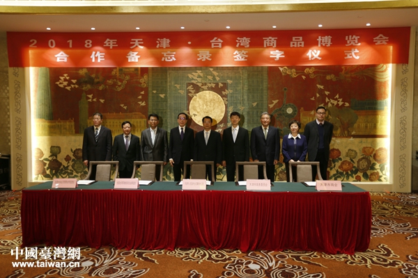 2018年天津·臺灣商品博覽會合作備忘錄簽約儀式現(xiàn)場。(圖片來源:天津市臺辦)