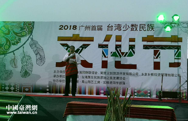 中國臺灣網5月8日廣州訊 日前,由廣州市臺灣同胞聯誼會、窩旅文創旅游開發有限公司、鄉土鄉根投資管理有限公司聯合主辦的 “廣州首屆臺灣少數民族文化節”在廣州市番禺區開幕。臺灣立法機構民意代表、臺灣原住民族生存發展協會理事長孔文吉專程從臺灣飛赴廣州參加開幕式,廣州市臺聯會長葉耀華、臺灣原住民族從業者代表、臺灣嘉賓、在穗臺商代表以及省、市、番禺區臺辦有關負責人共100余人參加了開幕式。