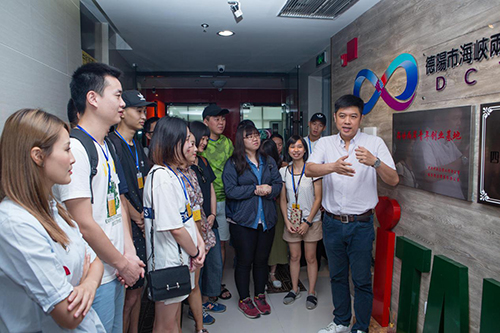 德陽市海峽兩岸青年創(chuàng)業(yè)園負(fù)責(zé)人、青年臺商許淵順向臺灣青年介紹園區(qū)創(chuàng)新創(chuàng)業(yè)情況。(四川省臺辦供圖)