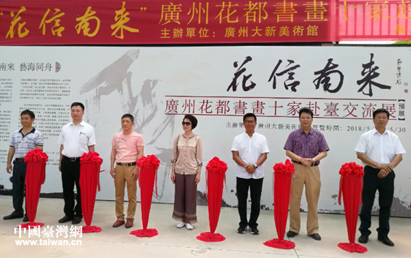 圖為臺資企業(yè)負(fù)責(zé)人和相關(guān)負(fù)責(zé)人為預(yù)展剪彩。(圖片來源:廣州市花都區(qū)臺辦)