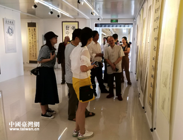 圖為觀眾參觀書法作品。(圖片來源:廣州市花都區(qū)臺辦)