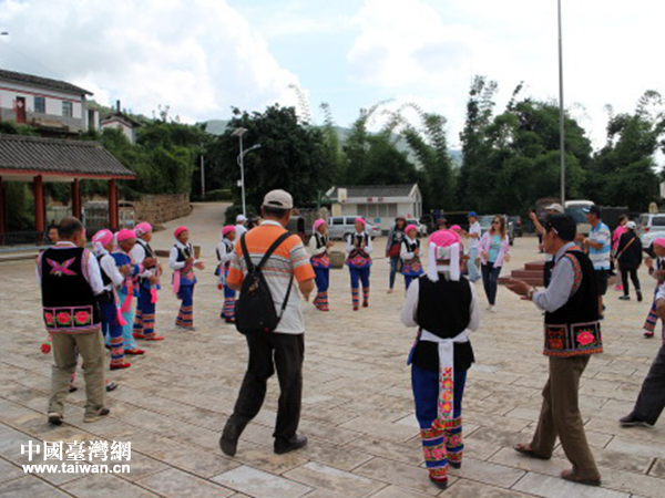 參訪團成員與峨山縣擺依寨群眾共同跳起民族舞蹈。(圖片來源:玉溪市臺辦、新平縣臺辦、峨山縣臺辦)