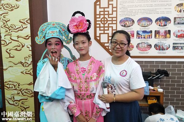兩位臺灣學生在臺上向大家展示粵劇學習成果。(圖片來源:梧州市臺辦)