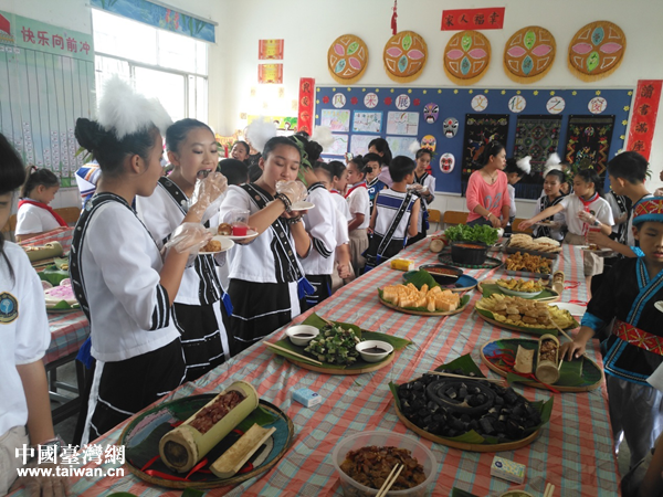 臺灣花蓮縣新城鄉北埔小學生品嘗壯鄉美食。(圖片來源:廣西河池市金城江區臺辦)