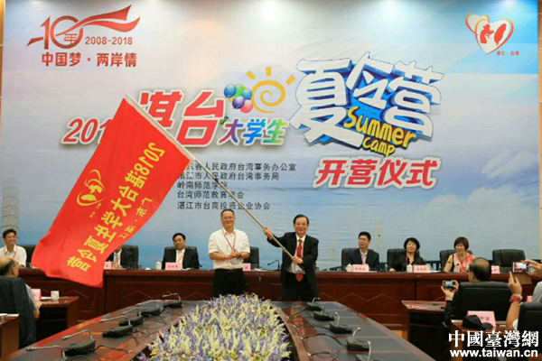 在開(kāi)營(yíng)儀式上,省臺(tái)辦副主任陳林佐簡(jiǎn)要介紹了廣東經(jīng)濟(jì)社會(huì)發(fā)展及粵臺(tái)交流的基本情況。充分肯定了湛江市近年來(lái)與臺(tái)灣開(kāi)展多層次、寬領(lǐng)域務(wù)實(shí)交流,搭建兩地常態(tài)化互訪交流平臺(tái)所作的積極努力;對(duì)長(zhǎng)期以來(lái)不遺余力關(guān)心支持推動(dòng)兩岸教育和青年學(xué)生交流合作的臺(tái)灣教育界人士,為增進(jìn)兩岸同胞親情福祉,推動(dòng)兩岸關(guān)系和平發(fā)展所作的積極貢獻(xiàn)表示贊賞。他表示,只有匯聚兩岸同胞的智慧和力量,才能把歷經(jīng)苦難而又生生不息的中華民族送達(dá)夢(mèng)想的彼岸。兩岸青年學(xué)子作為民族的未來(lái)?xiàng)澚汉托聲r(shí)代的主力軍,對(duì)于“中國(guó)夢(mèng)”的實(shí)現(xiàn)責(zé)無(wú)旁貸。希望兩岸青年學(xué)子樹(shù)立宏偉目標(biāo),懷揣遠(yuǎn)大理想,為國(guó)家、民族的富強(qiáng)努力奮斗。