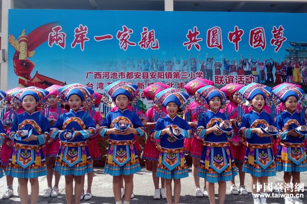 在都安瑤族自治縣安陽鎮(zhèn)第三小學(xué),2800多名師生以獨(dú)特的瑤族竹桿舞迎接臺(tái)灣同胞的到來。一場以“兩岸一家親 共圓中國夢”為主題的兩地聯(lián)誼表演,隨著安陽三小架子鼓《勇士凱旋》、《逆戰(zhàn)》帶起全場氣氛,臺(tái)灣同學(xué)民族舞蹈《快樂的舞吧》以優(yōu)雅獨(dú)特的民族舞姿給火熱的夏日帶來了親切與涼爽。