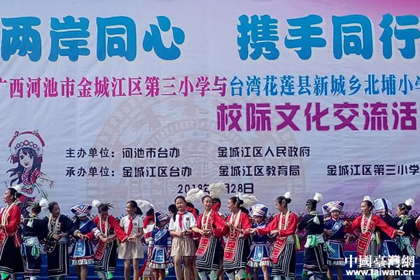 金城江區(qū)三小學(xué)生與臺(tái)灣客人同臺(tái)共舞。(圖片來源:河池市臺(tái)辦)