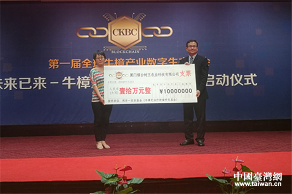 全球牛樟芝區(qū)塊鏈產(chǎn)業(yè)聯(lián)盟向中國社會福利基金會兩岸一家親基金捐贈10萬元。(中國臺灣網(wǎng) 郜利敏 攝)