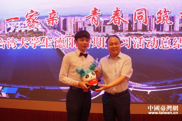 中國臺灣網8月10日德陽訊 8月3日,在四川省德陽市實習的32名臺灣大學生與德陽西部計劃志愿者、實習企業代表及部分嘉賓齊聚一堂,參加暑期實習活動總結會,至此,以“兩岸一家親·青春同筑夢”為主題的臺灣大學生暑期德陽實習活動圓滿落幕。德陽市委常委、市政府副市長王斐,臺灣中華兩岸教育文化交流學會中心主任黃百洲,德陽市臺辦、市人大民宗外僑委、團市委、德陽經開區管委會、旌陽區臺辦、德陽市海峽兩岸青年創業園等部門(單位)負責人出席會議。
