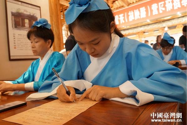 中國(guó)臺(tái)灣網(wǎng)8月24日福州訊 8月23日上午,“臺(tái)灣學(xué)子重走科舉路研習(xí)營(yíng)”的學(xué)子們身穿古裝在福州正誼書(shū)院內(nèi)參加了一場(chǎng)別開(kāi)生面的“鄉(xiāng)試”,親身體驗(yàn)臺(tái)灣士子參加科舉考試的歷史情景。北京市臺(tái)聯(lián)名譽(yù)會(huì)長(zhǎng)盧咸池、副會(huì)長(zhǎng)王慧,福州市臺(tái)聯(lián)會(huì)長(zhǎng)林鴻榕、副調(diào)研員許峰,臺(tái)灣華梵大學(xué)前校長(zhǎng)高柏園,臺(tái)灣銘傳大學(xué)廣播電視學(xué)系主任杜圣聰?shù)燃钨e出席活動(dòng)。