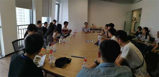 圖為聯盈創客園參觀時,青年創業臺商鄭欣怡與臺灣實習大學生交流創業經驗。
