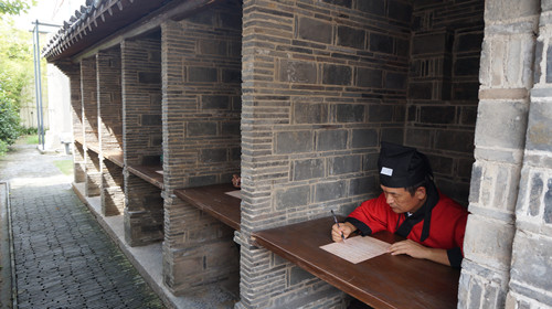 為了讓學(xué)子們?cè)敿?xì)了解科舉制度及臺(tái)灣士子參加科舉考試的歷史,重現(xiàn)古代學(xué)子在江南貢院參加科舉考試的景象,北京市臺(tái)聯(lián)專門制作了試卷,組織研習(xí)營(yíng)的學(xué)子們?cè)诳寂飪?nèi)進(jìn)行實(shí)景考試。