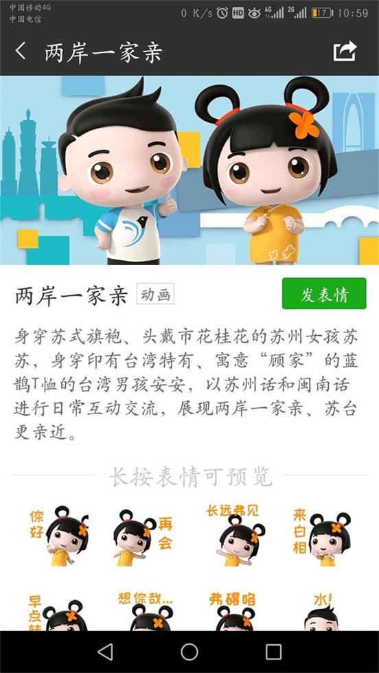 中國(guó)臺(tái)灣網(wǎng)8月31日蘇州訊 昨天,由蘇州市臺(tái)辦創(chuàng)意指導(dǎo)的“兩岸一家親”微信表情包正式上線。