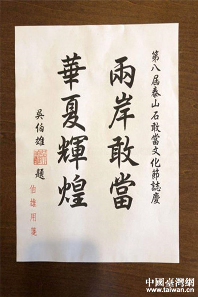 吳伯雄贈送字畫。(圖片來源:泰安市臺辦、泰山區臺辦)