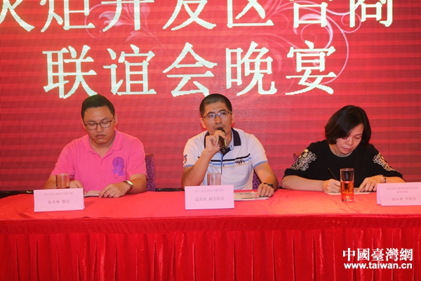 中山市治安管理支隊戶政大隊副大隊長溫燕嵩(中)、火炬開發區公安分局戶政中隊中隊長鄭小英(右)為火炬開發區臺商、臺胞宣講居住證申辦流程。(圖片來源:廣東省臺辦)