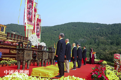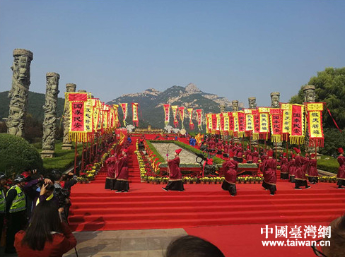中國臺灣網(wǎng)10月18日泰安訊 10月13日,2018海峽兩岸暨全球華人敬天祈福活動在山東泰安隆重舉行。本次活動由山東省政協(xié)文史資料委員會、泰安市政協(xié)、山東省海峽兩岸經(jīng)濟(jì)文化發(fā)展促進(jìn)會指導(dǎo),九州文化傳播中心、羅浮山國學(xué)院主辦,泰山風(fēng)景名勝區(qū)管理委員會、泰安市人民政府臺灣事務(wù)辦公室、山東綠地泉控股集團(tuán)、山東泰山文化研究院承辦。中國國民黨前副主席蔣孝嚴(yán)、國臺辦交流局副局長董碧幽,九州文化傳播中心主任王明鑒、秘書長尚君奇,山東省臺辦副主任張民忠,山東省政協(xié)文史資料委員會主任馬嘯,泰安市政協(xié)主席周桂萍、副主席程明,泰山景區(qū)管委會主任王光峰,泰安市臺辦主任張慶峰、副主任馬鵬舉,以及來自臺灣宮廟、工商界代表人士和1000余名傳統(tǒng)文化愛好者出席了活動。