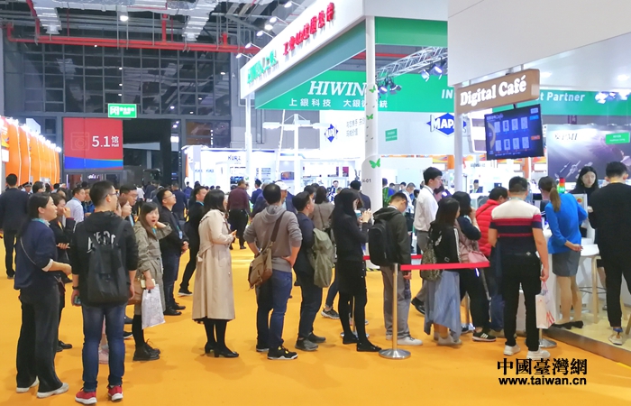 進博會現場展區,參觀者排隊體驗新科技產品。(上海市臺辦 常常 攝)