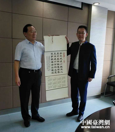韋仰哲先生向薛城區(qū)政府黨組副書記王明先饋贈(zèng)墨寶。(圖片來源:棗莊市薛城區(qū)臺(tái)辦)