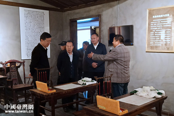 薛城區(qū)委書記姜山(左一)陪同棗莊市關(guān)工委主任高惠民(左二)視察種莊海峽兩岸書法傳承工作室。(圖片來源:棗莊市薛城區(qū)臺(tái)辦)