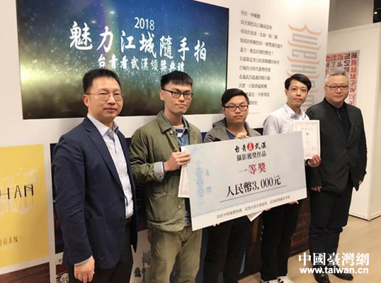 一等獎由曹子育(左2)、宋修宇(中)、戴有良(右2)為代表領獎,由武漢海峽兩岸交流促進會劉紅鳴會長(右1)與張強副會長(左1)共同頒發獎狀與獎金。(圖片來源:武漢市臺辦)