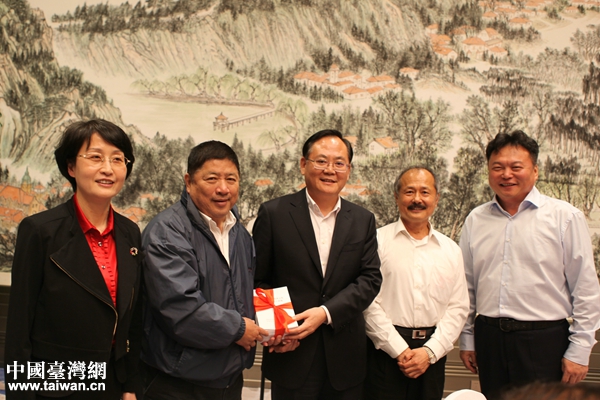10月25日,青島市委常委、統戰部部長王久軍向全國臺企聯會長王屏生等臺商代表贈送新出臺的《關于促進青臺經濟文化交流合作的若干措施》。(圖片來源:青島市臺辦)