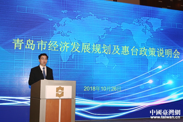 10月26日,市政府副秘書長萬建忠在青島市經濟發展規劃及惠臺政策說明會致歡迎辭。(圖片來源:青島市臺辦)