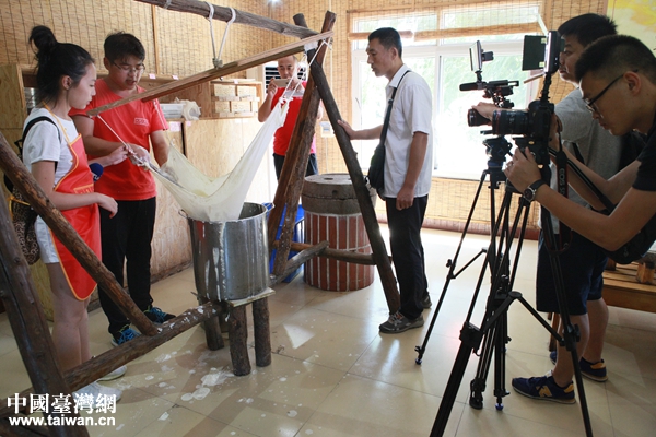 8月20日至22日,“回望齊魯好風光”魯臺新聞媒體記者聯合采風活動在青采訪,圖為兩岸記者在青島“二月二”生態觀光農場采訪體驗豆腐制作過程。(圖片來源:青島市臺辦)