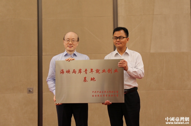 國臺辦主任劉結(jié)一向亞臺青海峽青年創(chuàng)業(yè)園授牌國家級“海峽兩岸青年創(chuàng)新創(chuàng)業(yè)基地”。(圖片來源:四川省臺辦)