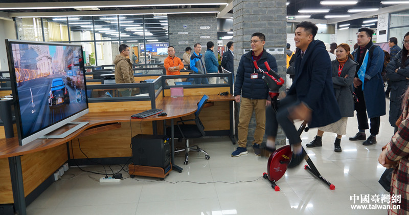在富士康南寧科技園孵化基地“三創(chuàng)加速中心”,廣西富夢(mèng)創(chuàng)新科技有限責(zé)任公司總經(jīng)理陳昱夫結(jié)合自己經(jīng)歷介紹了“三創(chuàng)加速中心”扶持臺(tái)灣青年創(chuàng)業(yè)情況,廣西晨昌科技有限公司業(yè)務(wù)經(jīng)理林員緯、毛伊咖啡總監(jiān)劉振業(yè)2位臺(tái)灣青年也與來(lái)訪的臺(tái)灣青年進(jìn)行交流互動(dòng),暢談創(chuàng)業(yè)心得。廣西晨昌科技有限公司研發(fā)“GAME-BIKE智能健身”系統(tǒng),將健身與游戲相結(jié)合,吸引來(lái)訪青年嘉賓紛紛一試身手。