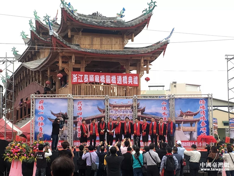中國臺灣網2月25日南投訊 2月23日,浙江泰順廊橋在臺灣南投縣落成開放。當天,臺灣南投縣集集鎮舉行了“圓橋”暨交接儀式,兩岸嘉賓和當地民眾3000余人人到場觀禮,并共同見證浙臺文化交流“新地標”落成開放。