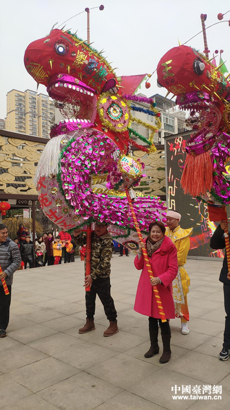 參訪團(tuán)在江欣苑社區(qū)體驗(yàn)高龍。(圖片來源:武漢市臺辦 王瑋 攝)