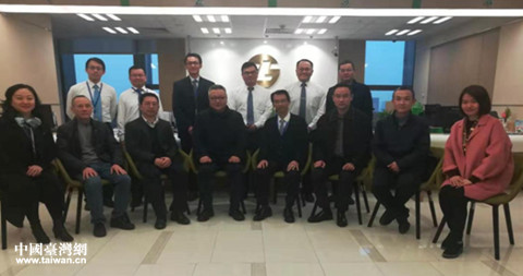 武漢市臺辦主任劉紅鳴(右4)、武昌區委常委陳鵬(右3)一行聽取企業負責人介紹企業情況。(武漢市臺辦 潘力 攝)