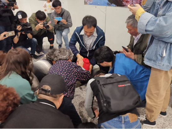 不斷有人拖著行李箱走出來,但都不是他們要等的人。兩位老人始終抬著手臂,高舉著錦旗,盯著出口處的每一個身影,一刻都不敢放松。終于,一個面色憔悴的中年男子走了出來,他的胸前掛著一個沉甸甸的背包,一邊走著,雙手小心地護著包。