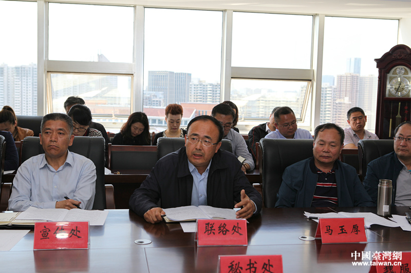 青島市臺港澳辦“臺港澳產業園建設攻勢”作戰方案答辯會,紀家棟主持會議并講話。(圖片來源:青島市臺港澳辦)