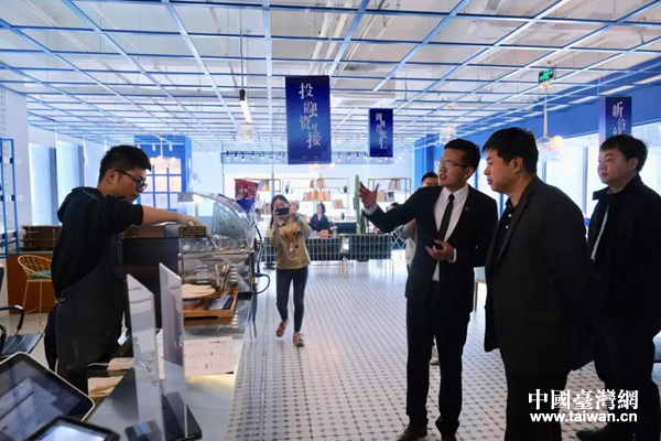 國臺辦經濟局副局長袁野(右二)在華燦工場了解“墻”咖啡理念。(圖片來源:四川省臺辦)