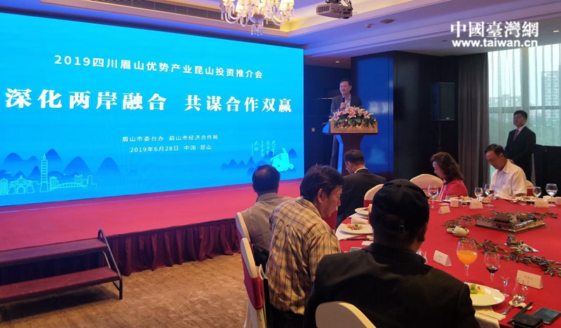 中國臺灣網(wǎng)7月23日訊 為進(jìn)一步加快海峽兩岸產(chǎn)業(yè)合作區(qū)眉山產(chǎn)業(yè)園建設(shè),近日,眉山市委臺辦、市經(jīng)濟(jì)合作局在江蘇昆山舉辦“2019四川眉山優(yōu)勢產(chǎn)業(yè)昆山投資推介會”。眉山市委常委、副市長李興乾出席并致辭,臺灣區(qū)電機(jī)電子工業(yè)同業(yè)公會(簡稱“電電公會”)副秘書長毛恩洸、昆山臺灣同胞投資企業(yè)協(xié)會常務(wù)副會長陳麗梅、副會長陳金鎮(zhèn)、吳榮六以及80余名臺企負(fù)責(zé)人出席推介會,眉山市政府副秘書長徐馳主持推介會。