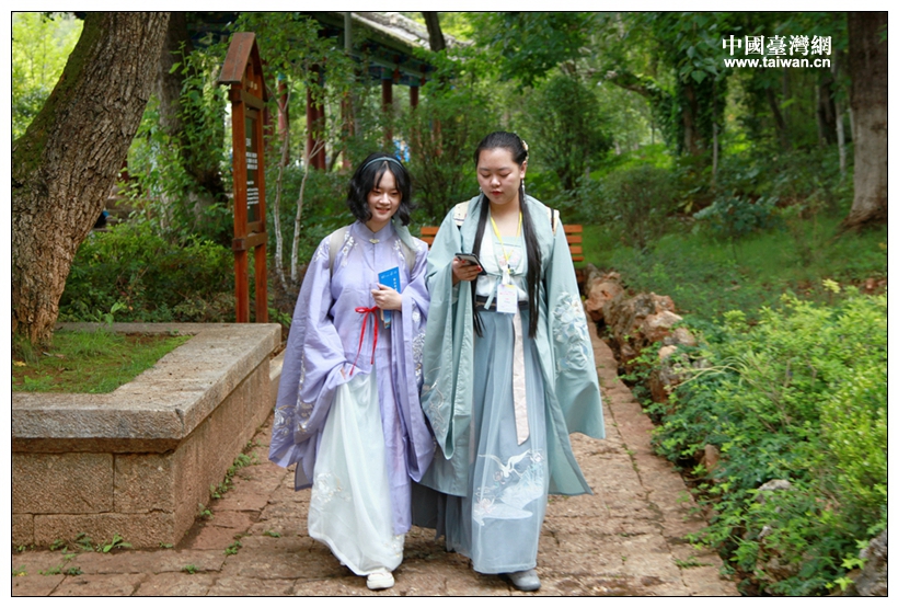 來(lái)自昆明理工大的張馨蕊和來(lái)自蘇州大學(xué)的李雯婷以漢服裝扮驚艷亮相(圖片來(lái)源:昆明市臺(tái)聯(lián))
