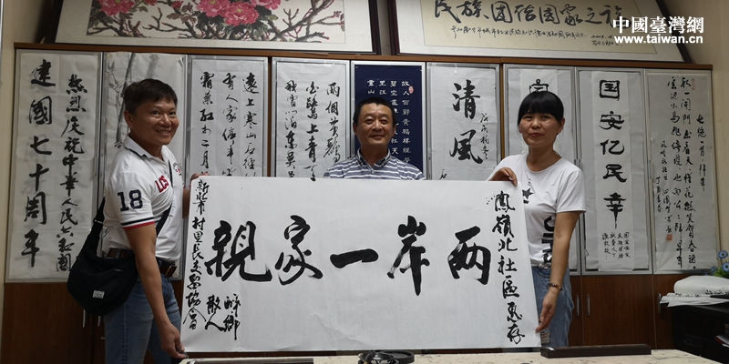 團員張宗麟書寫一幅“兩岸一家親”書法贈送鳳嶺北社區(圖片來源:廣西南寧市臺辦)