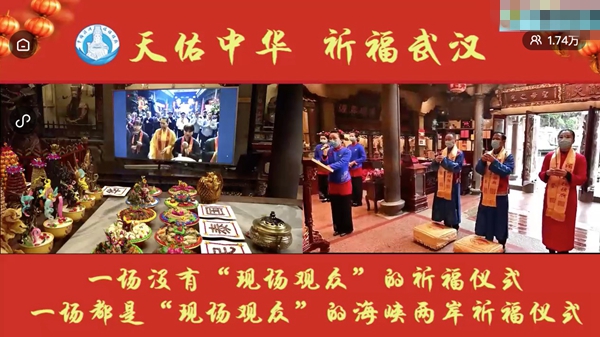 隔著一灣淺淺的海峽,兩岸宮廟在視頻屏幕中共同舉行莊嚴肅穆的三獻禮。林金贊說:“兩岸一家親,今天兩岸媽祖宮廟通過網絡連線,共同舉行“天佑中華 祈福武漢”活動,祈愿中華民族繁榮昌盛,疫情早日解除!”。