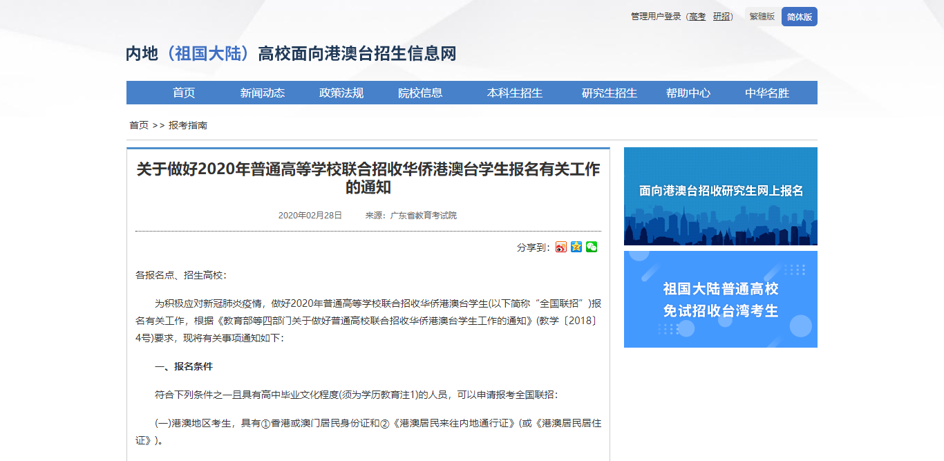 通知指出,大陸2020年普通高校聯(lián)合招收華僑港澳臺(tái)學(xué)生(以下簡(jiǎn)稱(chēng)“全國(guó)聯(lián)招”)報(bào)考條件、網(wǎng)上報(bào)名時(shí)間與往年一致。符合報(bào)名條件的考生須在3月1日-15日登錄全國(guó)聯(lián)招管理系統(tǒng)(網(wǎng)址:https://www.eeagd.edu.cn/lzks)完成網(wǎng)上報(bào)名。