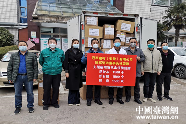 2月29日,臺企冠軍建材(安徽)有限公司向宿州市立醫院捐贈防護服1500件、護目鏡1500個、鞋套1500雙,總價值19萬余元。(圖片來源:宿州市臺辦)